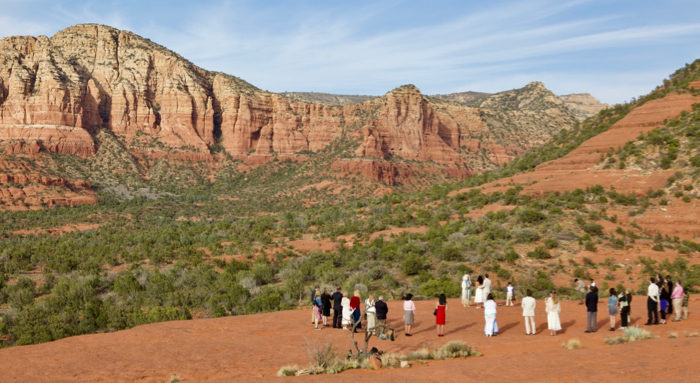 Would you believe — there’s a wedding happening right here, amidst the red rock. It reminds me of ours — the ancient chants, the tethers to tradition, the light of sky. It reminds me of that single moment: the universe opened, and we were married to everything.