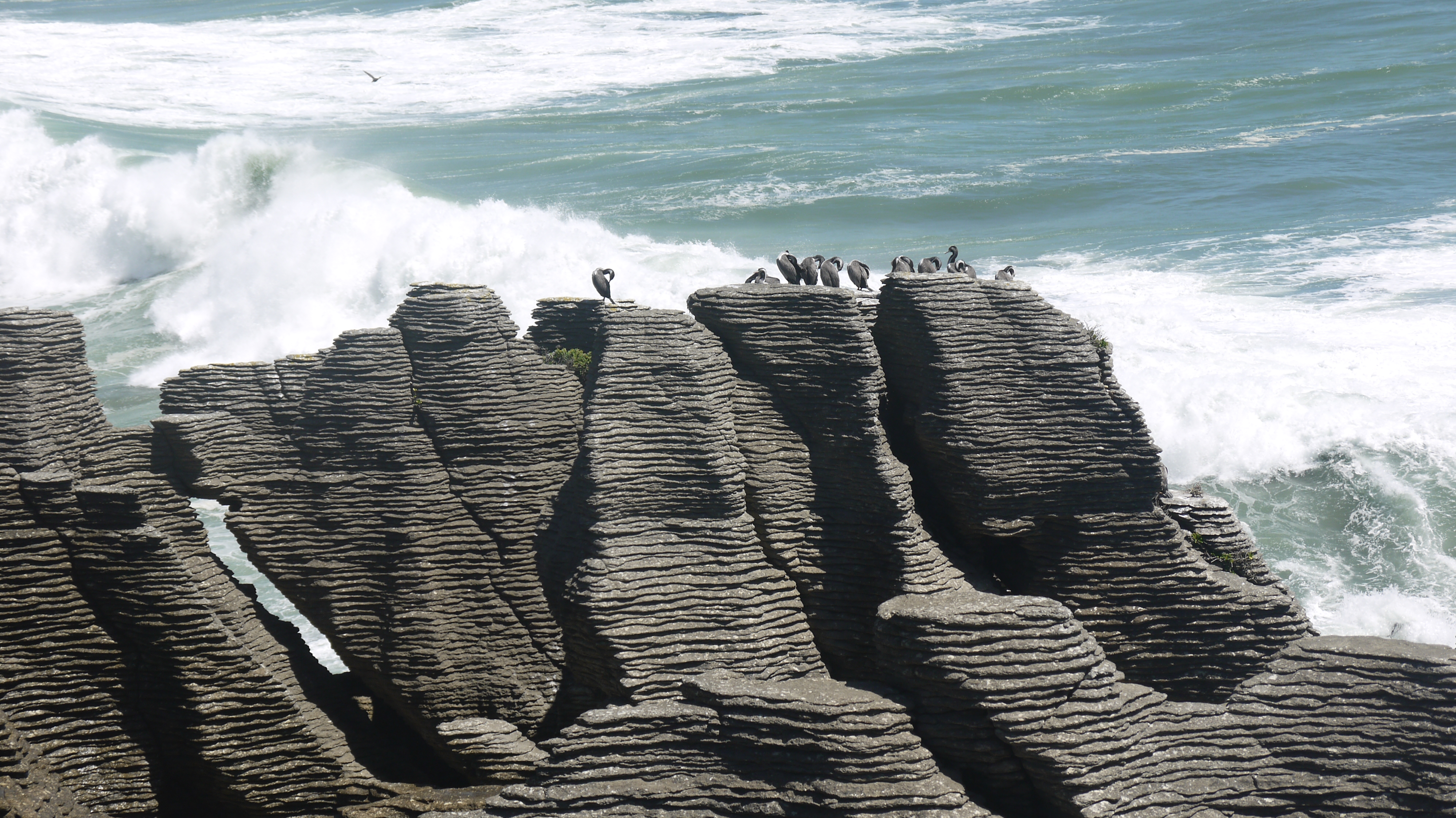 Punakaiki’s Pancake Rocks evolved over 30 million-years-ago, when hard fragments of expired lime-rich marine creatures set-down upon the sea bed, overlaid by soft plant sediments. Then earthquakes uplifted these layered deposits of resistant limestone and thin, mud-rich deposits above sea level, and were carved, compacted and solidified into these peculiar shapes by wind, rain and the Tasman Sea’s tenacious pressure. Actions which created these cliffs, bored caves, blowholes (geysers), lop-sided chasms and underground rivers. Sensing the roar of the churning waves rolling on the beaches in a white frothy surf, and the thunderous smack of water pounding rocks amid the whistling wind brings credence to the setting.