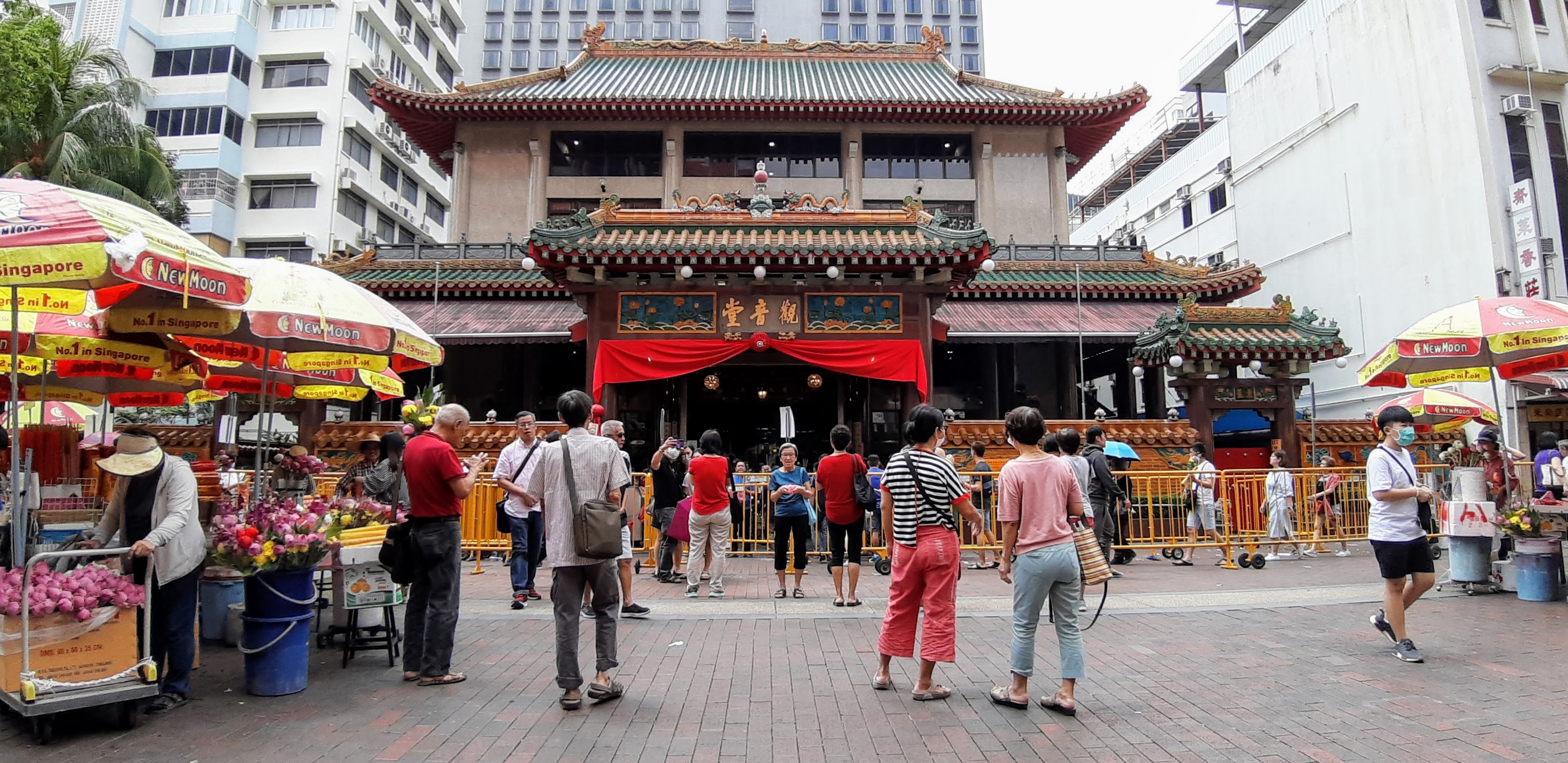 On the plaza between the temples, calls of “buy a flower?” supply the vocals amidst a jumble of red and yellow umbrellas and tents that mark the symbiotic commercial domain. Some shelter the stalls of vendors selling pink lotus blossoms, yellow chrysanthemums, oranges, and joss sticks. Others protect the al fresco offices of fortune-tellers and feng shui experts eager to consult on everything from finance to romance. All the while, devotees light their joss sticks and stop outside Kwan Im Thong Hood Cho to bow and pray. Before entering, they leave their joss sticks burning in the urn outside the entrance, the smoke, and ash of their prayers mingling with the smoke and ash of those who came before them.