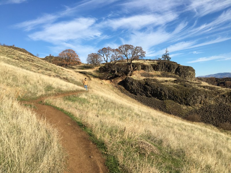 About five miles down the road we crossed the river to the sunny north side and entered that liminal place where west becomes east, where the locals start calling a “creek” a “crick” and firs turn to pine. That’s where we found Coyote Wall. We hiked, up and up and up, appreciating our sticks and the colossal views up- and downriver at the edge of the cliff.