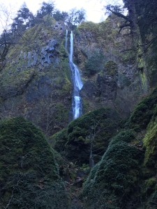 I consciously turned my lead foot into a powder puff and dilly-dallied my way down the highway watching the white caps on the Columbia and admiring the last leaves on the cottonwoods. Our first stop was Starvation Creek. It is located right on the highway about 5 miles west of Hood River. This was my second time there, Henry’s first. Those white caps translated into icy wind gusts and Henry wrapped his scarf around his face while I appreciated my backpack’s windbreaker abilities. We were also in the shade of naked big leaf maples and second growth firs on the south side of the highway where the sun rarely shines.