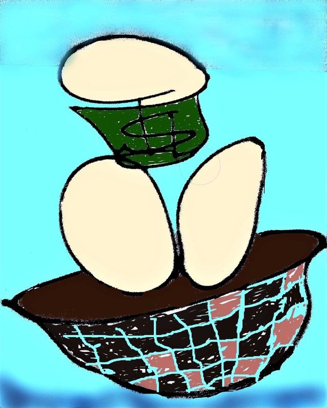 “All the Eggs in 1 Helmet” This Digitally Manipulated photo has no resemblance to the original, as it represents disproportionate military spending by US Gov (placing all its “eggs” in one helmet).