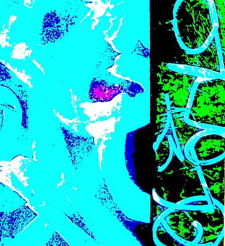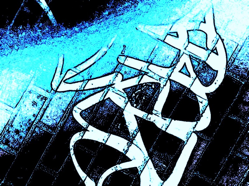 “Aqua-script” Electric blues and greens make this abstract image the antithesis of the original, tagged city dumpster shot.