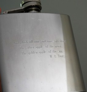 This flask cost me about five dollars a decade and a half ago. For another fifty dollars, I had it engraved with the last three lines from a W. B. Yeats poem, “The Song of Wandering Aengus,” a poem steeped in Celtic mythology, about Yeats’ own unending wandering search for artistic creation – fed by the heavenly and earthly ideals represented by gold and silver apples. His seachrán. His coddiwomple.