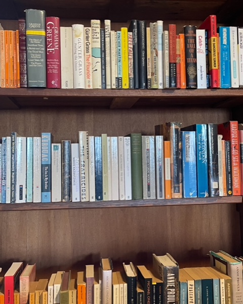 We went on to nearby Lawson for Rosey Ravelston Books. The place was freezing, and I didn’t want to move from the cozy gas heater. I did manage a few chilly steps to buy a used copy of a popular Australian book that everyone said I needed to read (Total so far: 3 books, 1 pen). Next, we drove on to Wentworth Falls and Good Earth Bookshop. This pleasant small shop was hosting a group of eight women painting in the back room. We chatted and one gave me a roll of decorative tape, but I didn’t buy any books (I proudly proclaim). Then it was a short walk to Blue Mist Café for lunch. The downstairs café was packed with the local lunch crowd, so the owner sent us upstairs to the “lounge.” Once there we discovered several large bookshelves bursting with used books. We had a great meal among the titles for our bookshop number six of the day. And coffee number three.